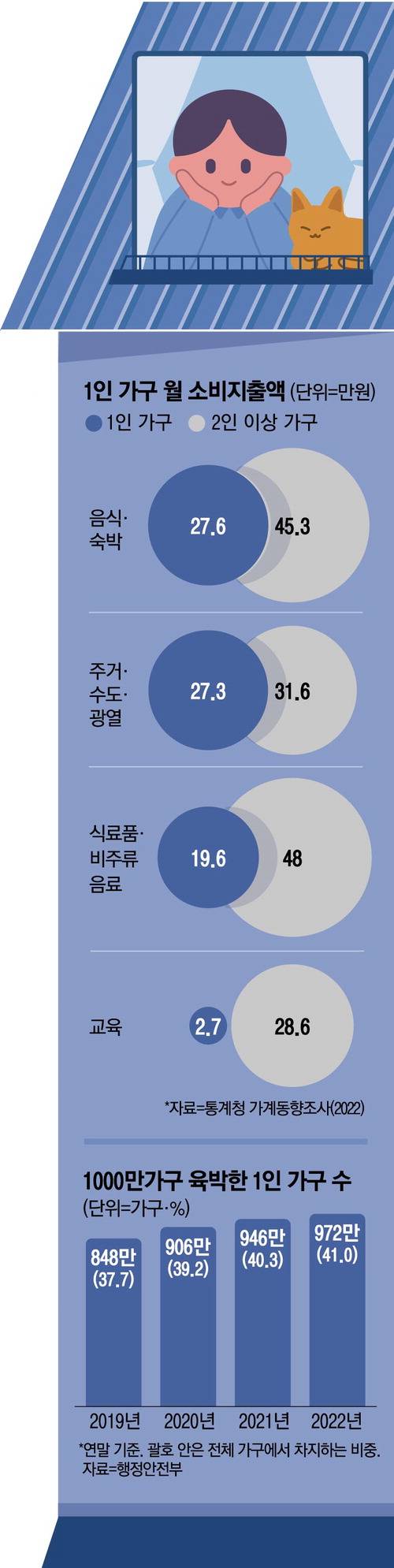 통계청은 "1인 가구는 자가 비율이 낮아 월세 등 실제 주거비 지출이 많고, 배달음식 등 외식을 자주 이용해 이 같은 지출 특성이 나타났다"고 분석했다.