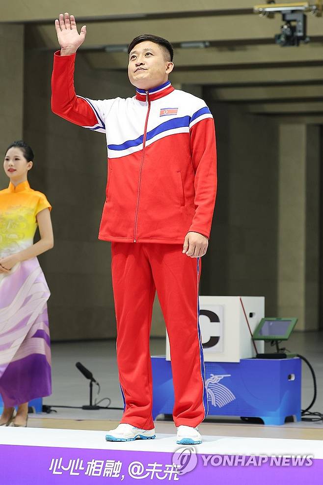 (항저우=연합뉴스) 신현우 기자 = 26일 중국 항저우 푸양 인후 스포츠센터에서 열린 제19회 항저우 아시안게임 남자 10m 러닝타깃 혼합 개인전에서 은메달을 딴 북한 권광일이 시상대에 올라 손을 흔들고 있다. 2023.9.26