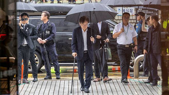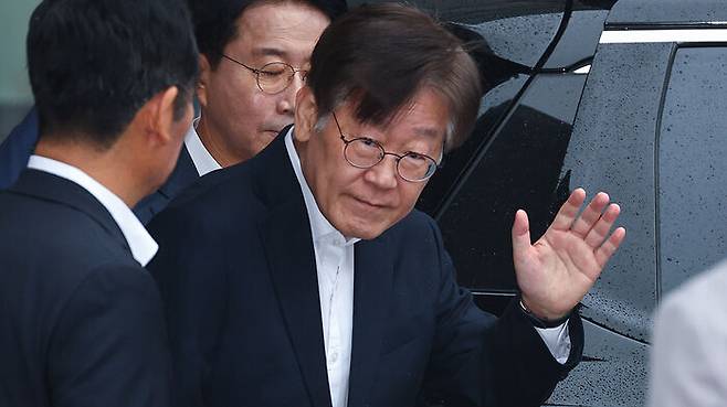 이 대표는 10시 3분에 서울중앙지법 청사에 도착했는데요, 빗길 교통체증으로 예상보다 다소 늦었습니다.