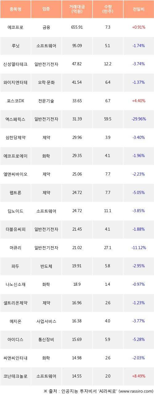 외국인 투자자의 순매수 상위 20개 종목은 에코프로, 루닛, 신성델타테크, 와이지엔터테인먼트, 포스코DX, 엑스페릭스, 삼천당제약, 에코프로에이치엔, 엘앤씨바이오, 펩트론등이다.