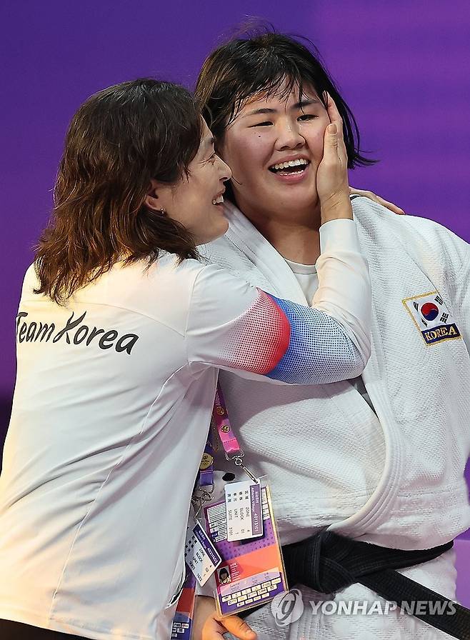 (항저우=연합뉴스) 박동주 기자 = 김하윤이 26일 중국 항저우 샤오산 린푸 체육관에서 열린 항저우 아시안게임 유도 여자 78㎏ 이상급 결승전에서 중국 쉬스옌을 상대로 승리한 뒤 김미정 감독으로부터 축하를 받고 있다. 2023.9.26