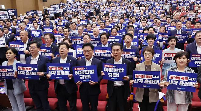 | ▲ 더불어민주당 박광온 원내대표와 의원들이 9월 20일 국회 의원회관에서 열린 '윤석열정권 폭정·검찰독재 저지 총력투쟁대회'에서 구호를 외치고 있다. |