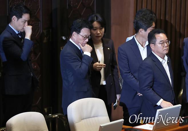 | ▲ 이재명 체포동의안 가결 소식에 굳은 민주당 박광온 원내대표를 비롯한 더불어민주당 의원들이 21일 서울 여의도 국회에서 열린 본회의에서 이재명 대표 체포동의안 개표 상황을 지켜보며 표정이 굳어 있다. |