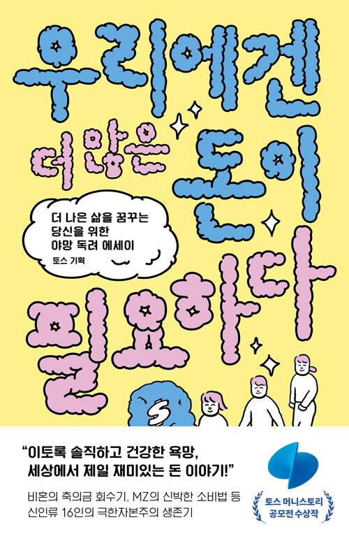 돈을 향한 욕망을 솔직하게 담은 이야기 16편이 한 권의 책으로 엮였다. 금융 앱 토스가 ‘모든 돈 이야기는 쓰일 가치가 있다’는 슬로건 아래 공모한 ‘제1회 토스 머니스토리 드래프트’(DRAFT) 당선작들이다. 100대 1의 경쟁률을 뚫고 선정된 이야기들은 극한의 자본주의를 살아가는 사람들이 돈을 벌고, 쓰고, 불리고, 때로는 기꺼이 나누는 다채로운 풍경을 세밀화처럼 담고 있다.