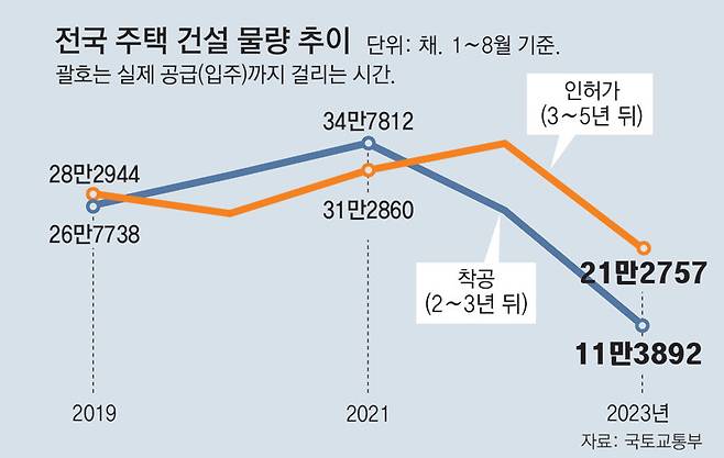 26일 정부가 주택 공급 활성화 방안을 내놓은 건 고금리와 공사비 급등 등으로 향후 주택 공급을 가늠하는 지표인 주택 착공이 반 토막 난 가운데 당장 2, 3년 뒤 주택 공급을 늘리기 위해서다. 공공 부문은 물량을 늘리고 민간 부문은 건설사 자금난을 해소해 착공과 분양 등을 차질 없게 하려는 취지다.