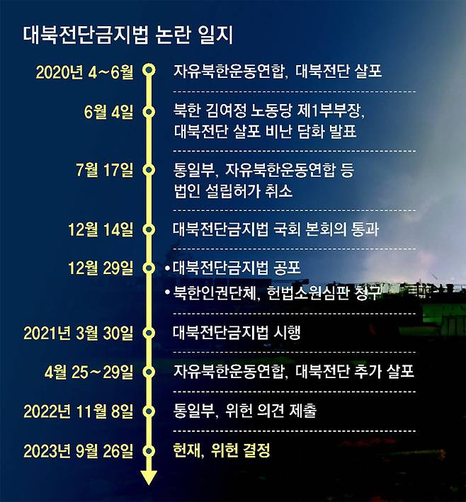 이날 위헌 결정이 나온 조항은 탈북자 단체 자유북한운동연합(대표 박상학)이 2020년 4∼6월 접경 지역에서 대북 전단 50만여 장을 날린 게 발단이 돼 만들어졌다. 당시 김여정 북한 노동당 제1부부장은 담화를 내고 “쓰레기들의 광대놀음(대북전단 살포)을 저지시킬 법이라도 만들라”고 했다. 이후 불과 4시간 만에 통일부가 대북전단금지법을 추진 중이라고 밝혔고 ‘김여정 하명법’이란 당시 야당(국민의힘)의 반대에도 불구하고 더불어민주당은 개정안을 단독으로 통과시켰다.