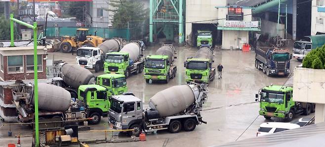 26일 인천 남동구의 한 레미콘 공장에서 차량들이 레미콘을 싣기 위해 서 있다.