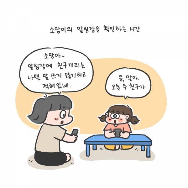 "소망아~ 알림장에 친구끼리는 나쁜 말 쓰지 않기라고 적혀있네."