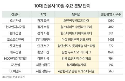 부동산시장 조사업체 부동산인포에 따르면 10월 한 달 동안 2023년 시공능력평가 10위 내 건설사의 시공단지는 총 1만 6879가구(컨소시엄 포함)가 일반 분양할 예정이다. 지난 8월까지 총 3만 3070가구, 월 평균 4758가구 분양에 그쳤던 것에 비해 기간 대비 많은 물량이 집중된 셈이다.