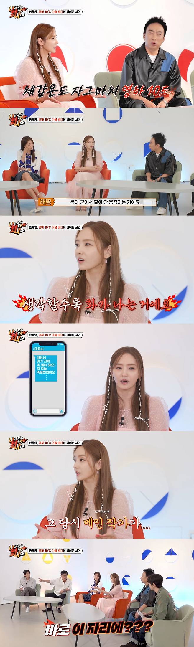 한채영은 "몸이 굳어서 팔이 안 움직이더라. 나올 때 저체온증까지 왔었다. 순간 '내가 목숨 걸고 이걸 해야 하나?' 싶어서 화가 나더라. 새벽 2시에 대표한테 장문의 문자를 보냈다. 그 당시 메인 작가님이 여기 앉아 계신다"고 털어놓아 MC들을 놀라게 했다.