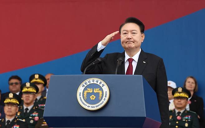 | ▲ 윤석열 대통령이 26일 성남 서울공항에서 열린 건군 제75주년 국군의날 기념식에서 거수 경례를 하고 있다. |