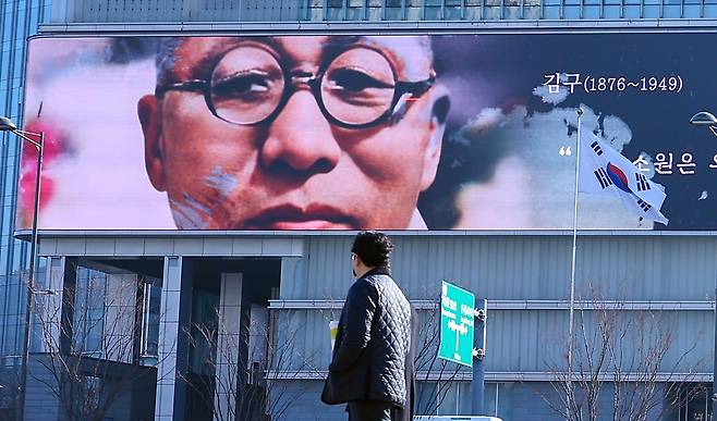 | ▲ 2023년 2월 27일 서울 종로구 대한민국역사박물관 외벽에 컬러로 복원된 김구 선생의 사진이 테스트 송출되고 있다. |