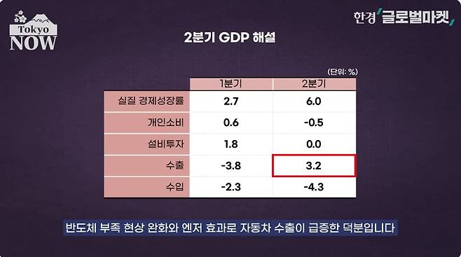 일본 GDP의 70%를 차지하는 개인소비와 설비투자가 부진했는데도 경제가 6% 성장할 수 있었던 것은 경제의 체질이 바뀌었기 때문이라는 분석이다. 개인소비와 설비투자 등 내수는 2분기 경제성장률을 1.2%포인트 끌어내렸다.