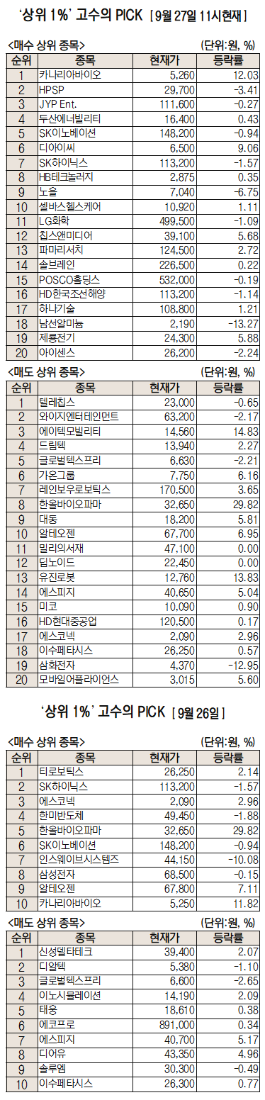 미래에셋증권에서 거래하는 고수익 투자자들이 27일 오전 가장 많이 순매수한 종목은 카나리아바이오(016790)로 나타났다. HPSP(403870), JYP Ent.(035900), 두산에너빌리티(034020), SK이노베이션(096770) 등도 상위권에 이름을 올렸다. 이날 미래에셋엠클럽에 따르면 미래에셋증권 주식 거래 고객 중 최근 1개월 간 투자수익률 상위 1%에 해당하는 ‘주식 초고수’들이 오전 11시까지 가장 많이 사들인 종목은 카나리아바이오로 집계됐다.