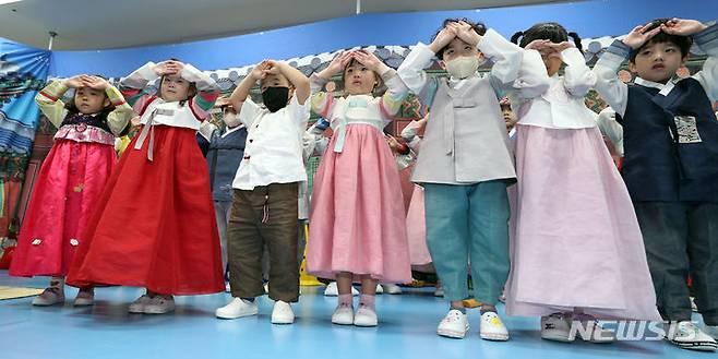 [부산=뉴시스] 하경민 기자 = 추석 연휴를 하루 앞둔 27일 부산 부산진구청 어린이집에서 원생들이 큰절하는 법을 배우고 있다. 2023.09.27. yulnetphoto@newsis.com