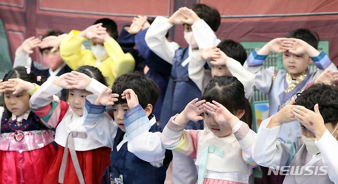 [부산=뉴시스] 하경민 기자 = 추석 연휴를 하루 앞둔 27일 부산 부산진구청 어린이집에서 원생들이 큰절하는 법을 배우고 있다. 2023.09.27. yulnetphoto@newsis.com