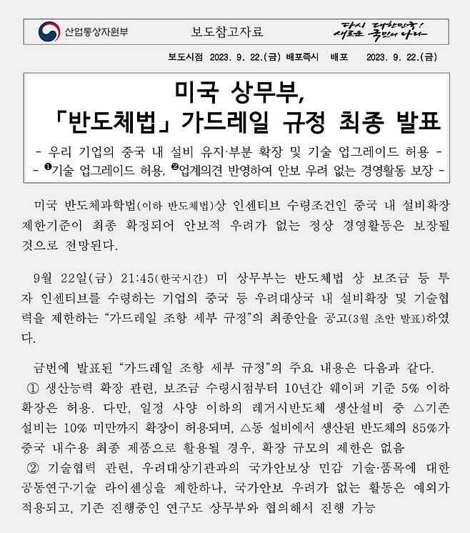 | ▲ 미 상무부가 발표한 반도체법 가드레일 규정을 설명하는 산업부의 보도자료 |