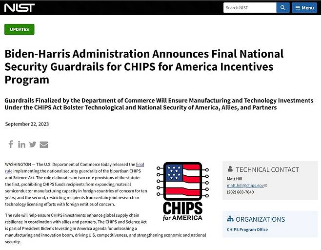 | ▲ 미국 상무부 산하 표준기술연구소(NIST)의 반도체법 가드레일 발표 내용 |