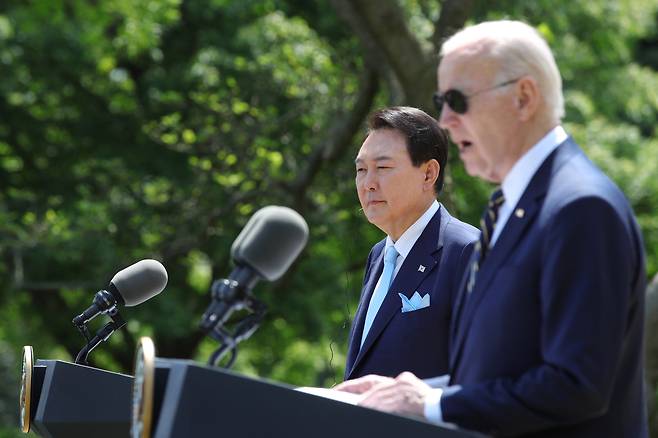 | ▲ 지난 4월 26일(현지시간) 미국을 국빈 방문한 윤석열 대통령이 미국 워싱턴DC 백악관 로즈가든에서 열린 한미정상 공동 기자회견에서 조 바이든 대통령의 발언을 듣고 있다. |