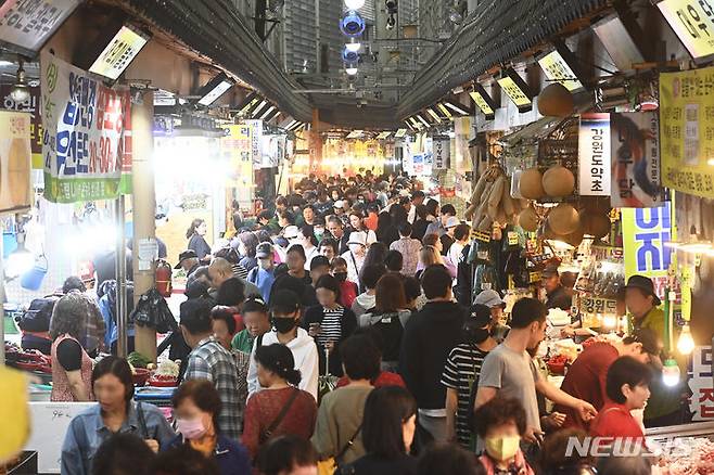 [수원=뉴시스] 김종택기자 = 추석을 이틀 앞둔 27일 경기도 수원시 팔달구 못골시장이 명절 상차림 준비를 위해 장보러 온 시민들로 북적이고 있다. 2023.09.27. jtk@newsis.com