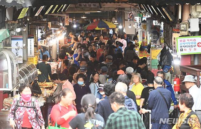 [수원=뉴시스] 김종택기자 = 추석을 이틀 앞둔 27일 경기도 수원시 팔달구 못골시장이 명절 상차림 준비를 위해 장보러 온 시민들로 북적이고 있다. 2023.09.27. jtk@newsis.com