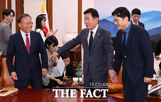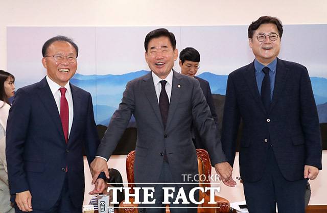 추석 연휴 앞두고 국회의장과 함께 손잡은 여야 원내대표 [TF사진관]
