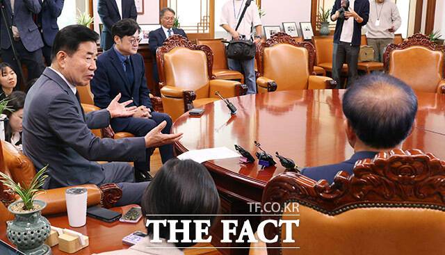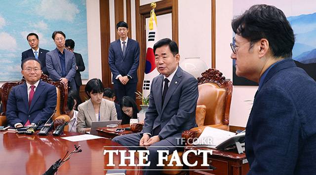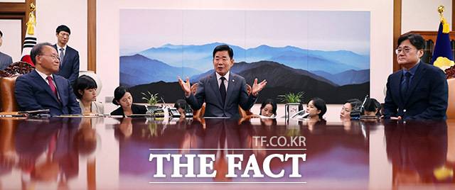 [더팩트ㅣ국회=남용희 기자] 윤재옥 국민의힘 원내대표와 김진표 국회의장, 홍익표 더불어민주당 원내대표(왼쪽부터)가 27일 오전 서울 여의도 국회에서 열린 국회의장 주재 여야 원내대표 회동에서 기념촬영을 하고 있다.