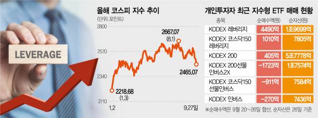 27일 한국거래소에 따르면 개인투자자들은 20일(현지 시간) 미국 연방공개시장위원회(FOMC) 회의 이후 글로벌 금리가 오르며 증시가 약세를 보이자 최근 한 주간(9월 20~26일) 삼성자산운용의 KODEX 레버리지 ETF를 4490억 원어치나 사들였다. 이 ETF는 코스피200지수의 일일 수익률을 2배로 추종한다.