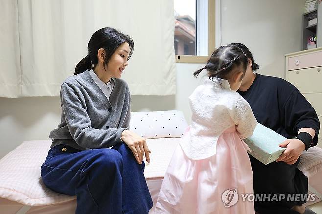 (서울=연합뉴스) 임헌정 기자 = 윤석열 대통령 부인 김건희 여사가 추석을 앞둔 27일 서울 송파구의 미혼모자가족 복지시설을 방문해 미혼모와 아이에게 선물을 전달하고 있다. 2023.9.27 [대통령실 제공. 재판매 및 DB 금지]