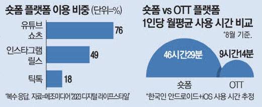한편 현재 국내 숏폼 시장은 구글, 메타 등 해외 빅테크의 플랫폼 이용 비중이 높다. 디지털 마케팅 기업 메조미디어가 지난 7월 전국 15~59세 남녀 1000명을 대상으로 진행한 설문 결과 보고서인 ‘2023 디지털 라이프스타일’에 따르면 숏폼 플랫폼 이용 비중은 유튜브 쇼츠(76%‧이하 복수응답 기준)가 압도적으로 높은 것으로 나타났다. 인스타그램 릴스(49%), 틱톡(18%)이 그 뒤를 이었다.