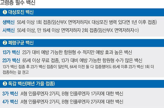 폐렴은 세균, 바이러스 등의 원인으로 폐와 기관지에 발생하는 염증성 질환이다. 최근 5년간 폐렴 사망자는 65세 이상 연령층이 90% 이상일 정도로 고령층에게 위험하다. 폐렴구균 백신은 예방 가능한 혈청형에 따라 23가 다당류백신(PPSV)과 13가 단백접합백신(PCV)이 사용되고 있다. 23가 백신은 더 많은 혈청형에 대한 대비가 가능하며, 13가 백신은 예방 가능한 혈청형 수는 적지만 예방 효과가 높다는 장점이 있다. 만성질환자의 경우에는 두 가지 백신을 모두 접종하는 걸 권고하고 있다. 특히 고령층에는 필수적인 백신으로, 65세 이상이면 23가 백신을 무료로 맞을 수 있다.