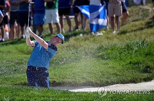 epa10885734 Europe's Scottish golfer Robert MacIntyre plays a bunker shot during practice rounds for the 2023 Ryder Cup golf tournament at Marco Simone Golf Club in Guidonia, near Rome, Italy, 27 September 2023. The 44th Ryder Cup matches between the US and Europe will be held in Italy from 29 September to 01 October 2023. EPA/ETTORE FERRARI