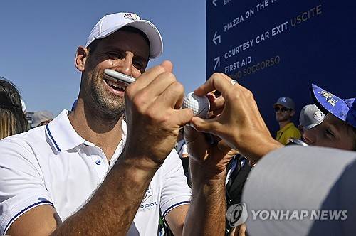 epa10885920 Serbian tennis player Novak Djokovic signs a golf ball to a fan during the All Star Match at the 2023 Ryder Cup golf tournament, in Guidonia, near Rome, Italy, 27 September 2023. The 44th Ryder Cup matches between the US and Europe will be held in Italy from 29 September to 01 October 2023. EPA/RICCARDO ANTIMIANI