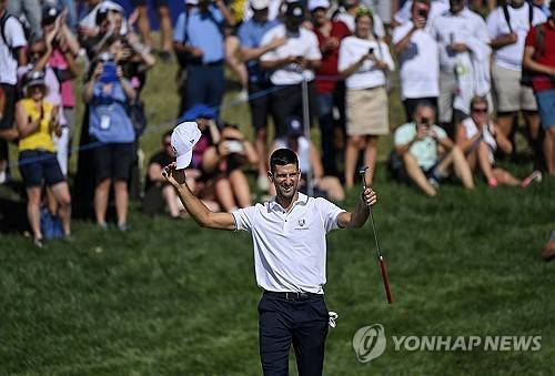 epa10885921 Serbian tennis player Novak Djokovic reacts during the All Star Match at the 2023 Ryder Cup golf tournament, in Guidonia, near Rome, Italy, 27 September 2023. The 44th Ryder Cup matches between the US and Europe will be held in Italy from 29 September to 01 October 2023. EPA/RICCARDO ANTIMIANI