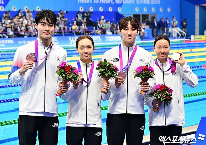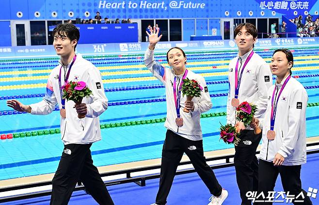 (엑스포츠뉴스 중국 항저우, 김지수 기자) 한국 수영의 항저우 아시안게임 메달 수집은 개막 4일차에도 멈추지 않았다. 간판 스타 황선우(20)가 자유형 200m 금메달을 목에 걸고 아시아 정상에 오른 것은 물론 혼성 혼계영 400m에서도 단체전 메달을 하나 더 추가하는 쾌거를 이뤘다.