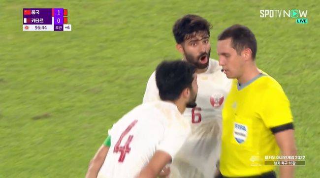 중국은 카타르와 경기에서도 심판 판정의 수혜를 봤다. 후반전 추가시간은 6분이 주어졌지만, 사실상 3분 정도는 경기를 진행하지 못한 채 흘러갔다. 양 팀 선수단이 한 데 뒤엉켜 충돌하며 코칭스태프까지 충돌했고, 경고도 무더기로 나왔다. 여기에 중국 골키퍼가 갑자기 쓰러져 근육 통증을 호소하며 경기를 지연하기도 했다.