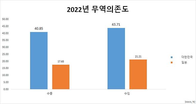일본과 비교하면 어느정도로 높은 수준인지 알 수 있다. 지난해 일본 수출 의존도는 17.65%, 수입 의존도는 21.21%를 기록했다. 무역 의존도는 38.9%에 불과하다. 인구 차이 등으로 단순 비교는 어렵지만, 우리나라 무역 의존도가 두 배 이상 더 큰 것도 사실이다.