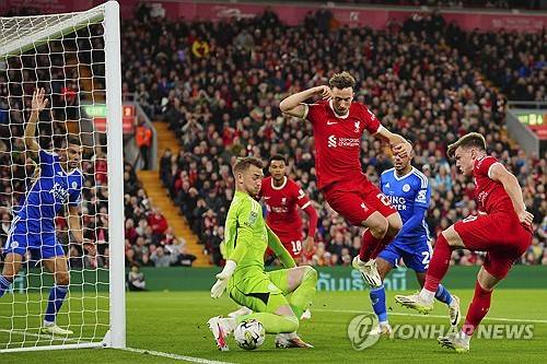 Liverpool's Ben Doak, right, attempts a shot at goal in front of Leicester's goalkeeper Jakub Stolarczyk during the English League Cup third round soccer match between Liverpool and Leicester City at the Anfield stadium in Liverpool, England, Wednesday, Sept. 27, 2023. (AP Photo/Jon Super)