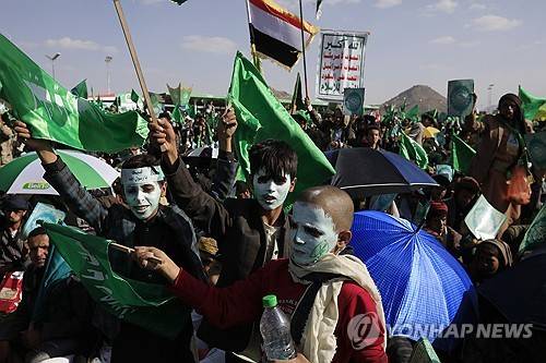 epa10886504 Yemenis wave flags during the Mawlid celebration, in Sana'a, Yemen, 27 September 2023. Thousands of Yemenis gathered at al-Sabaeen square in Sana'a to commemorate the birthday of the Prophet Muhammad, known as Mawlid, which is annually celebrated by many Muslim countries on the 12th day of Rabi al-Awwal, the third month of the Islamic calendar. The Prophet Muhammad was born in Mecca in Saudi Arabia in 570 AD. EPA/YAHYA ARHAB