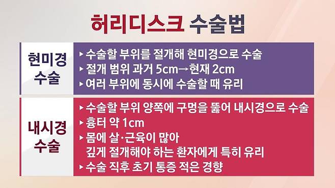 [박상민 / 분당서울대병원 정형외과 교수: "현미경 수술도 2~3cm밖에 절개가 안 되기 때문에 환자분들이 일상생활에 복귀하는 정도엔 영향을 미치지 않습니다. 다만 양방향 내시경 수술은 수술 다음날이나 이틀 뒤 통증이 적기 때문에 (수술 이틀 뒤 퇴원하는) 현미경 수술보다 하루 정도 일찍 퇴원하시는 경우도 있고요. 또 근육이 굉장히 중요한 운동선수 같은 경우에는 근육을 좀 더 보존할 수 있는 장점이 있지만, 기본적으로 큰 격차는 없었습니다."]