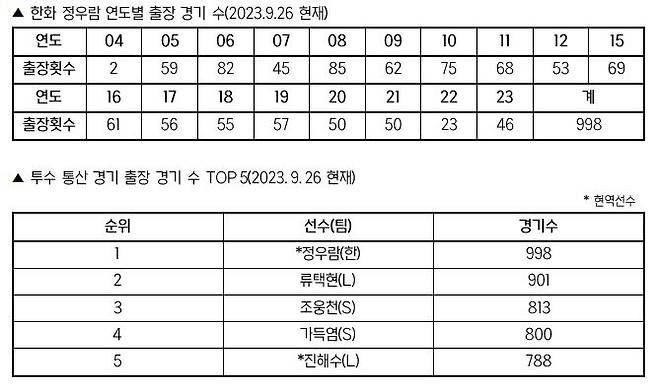 정우람은 KBO리그 역대 투수 최초로 1000경기 출장을 앞두고 있다. 정우람은 26일까지 통산 998경기에 출장했다. 이미 역대 최다 출장 기록을 보유하고 있는 투수인데, 2경기만 더 나오면 역대 처음으로 1000경기 출장을 달성하는 투수로 역사에 이름을 새기게 된다.