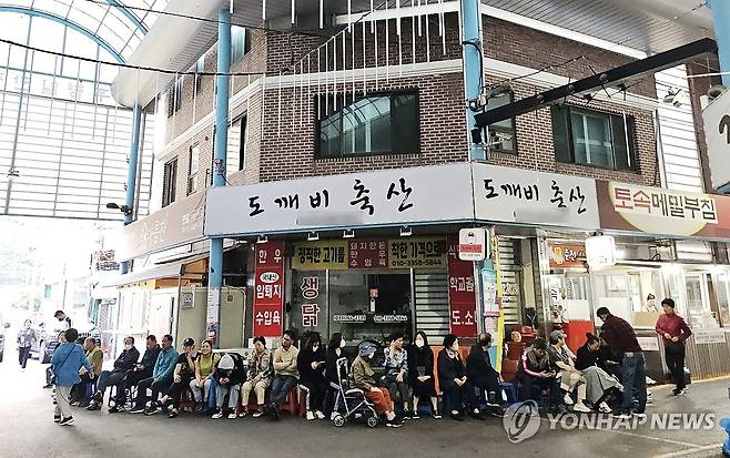 (춘천=연합뉴스) 양지웅 기자 = 추석 연휴 시작인 28일 강원 춘천시 한 전통시장 내 메밀부침 가게 앞이 구매객으로 장사진을 이루고 있다. 2023.9.28