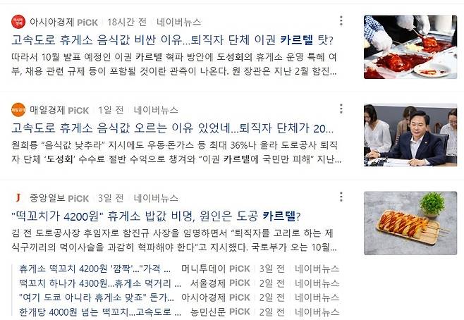 언론은 휴게소 음식값을 낮추라는 국토교통부 장관의 지시에도 불구하고 반대로 10% 이상씩 가격이 올랐다며 도로공사 퇴직자 단체인 '도성회'가 그 배후에서 거액의 수수료를 챙기고 있다고 보도했습니다.