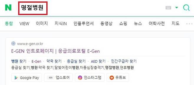검색 후 상단에 노출되는 응급의료포털(www.e-gen.or.kr) '이젠(E-Gen)'에서도 관련 정보를 얻을 수 있습니다.