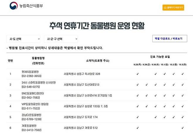 이때 농림축산품부 홈페이지에 접속하면 연휴 기간 빠르게 진료를 받을 수 있는 '우리동네 응급동물병원' 정보를 확인할 수 있습니다.