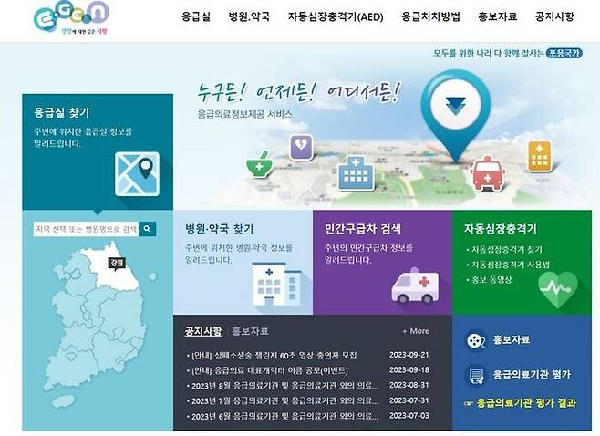 이뿐만 아니라 야간진료기관 정보와 자동심장충격기(AED) 위치, 응급처치 요령 등 응급 상황에 유용한 내용들도 함께 확인 가능합니다.