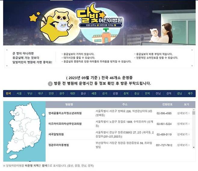 달빛어린이 병원 홈페이지(https://me2.kr/HkDpE)에 접속하면 △서울(3곳) △부산(3곳) △인천(3곳) △광주(1곳) △대전(2곳) 등 지역별로 병원 정보가 제공됩니다.