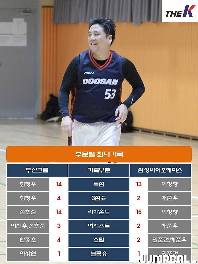 두산그룹은 24일 서울 관악구 인근 체육관에서 열린 2023 The K직장인농구리그(www.kbasket.kr) 2차대회 디비전 2 A조 예선에서 최형우(14점, 3점슛 4개)가 존재감을 마음껏 뽐낸 가운데, 한종호(13점 6리바운드 4스틸), 김동현(12점) 등 출전선수 모두 고른 활약을 펼친 데 힘입어 삼성바이오에피스를 60-33으로 잡고 2연패 늪에서 탈출했다.