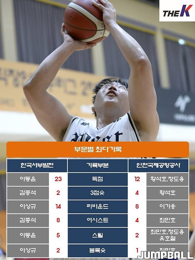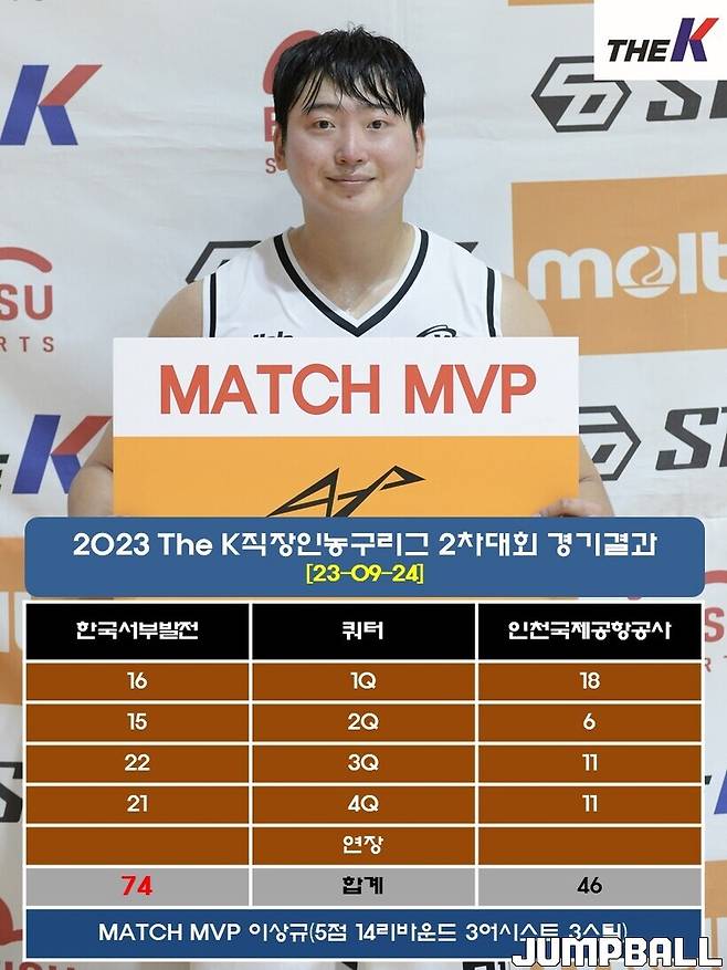한국서부발전은 24일 서울 관악구 인근 체육관에서 열린 2023 The K직장인농구리그(www.kbasket.kr) 2차대회 디비전 2 B조 예선에서 이동윤(23점 7어시스트 5스틸), 김종석(22점 8어시스트 5리바운드, 3점슛 2개), 김효성(18점 12리바운드 3어시스트) 삼각편대와 이상규(5점 14리바운드 3어시스트 3스틸) 활약을 묶어 인천국제공항공사를 74-46으로 잡고 4연승을 내달렸다.
