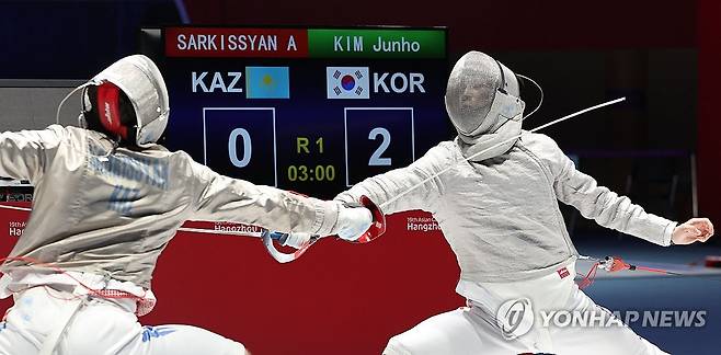 (항저우=연합뉴스) 김인철 기자 = 28일 중국 항저우 전자대학 체육관에서 열린 19회 항저우 아시안게임 펜싱 남자 사브르 단체 준결승전에서 한국 김준호가 카자흐스탄 아르을 상대하고 있다. 2023.9.28